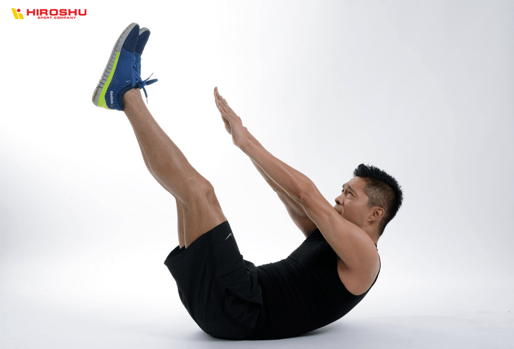 - Nâng người và hai chân lên từ từ, hai tay vươn thẳng về phía đầu ngón chân.