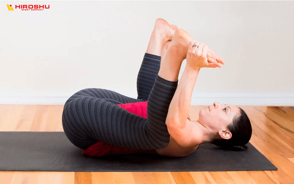- Duỗi thẳng chân trái sát trên mặt đệm, chân phải gấp vào bụng, hai bàn tay cài vào nhau ở phía sau đùi phải.