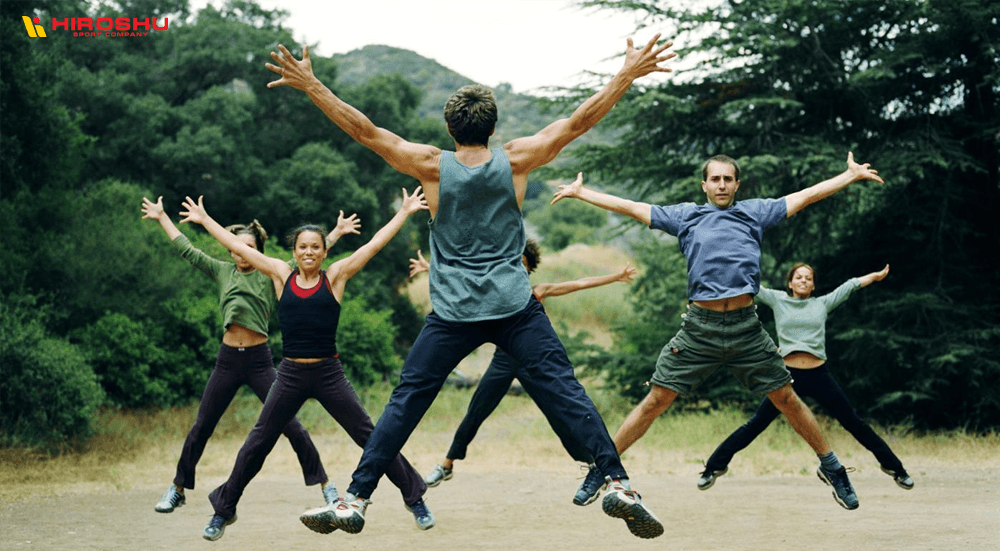 - Cách thực hiện: Hai chân đứng thẳng, đan vào nhau, đặt 2 tay bên hông. Nhảy lên kết hợp động tác nâng cao cánh tay trên đầu cùng thời điểm bật nhảy và hai chân đưa ra ngoài. Ngay lập tức đảo ngược chuyển động và trở lại vị trí ban đầu, thực hiện động tác dần dần nhanh hơn.