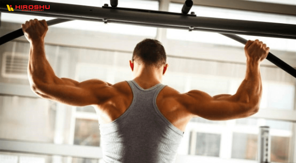 - Cách thực hiện: Nếu không có xà ngang để tập, bạn có thể tìm kiếm một vị trí chắc chắn giúp bạn có thể treo người lên trên. Thực hiện động tác, bạn nắm tay thanh xà, tay thả hết cỡ để treo người, kéo cơ thể lên cao sao cho cằm vượt cao hơn xà và hạ người từ từ trở lại tư thế ban đầu.