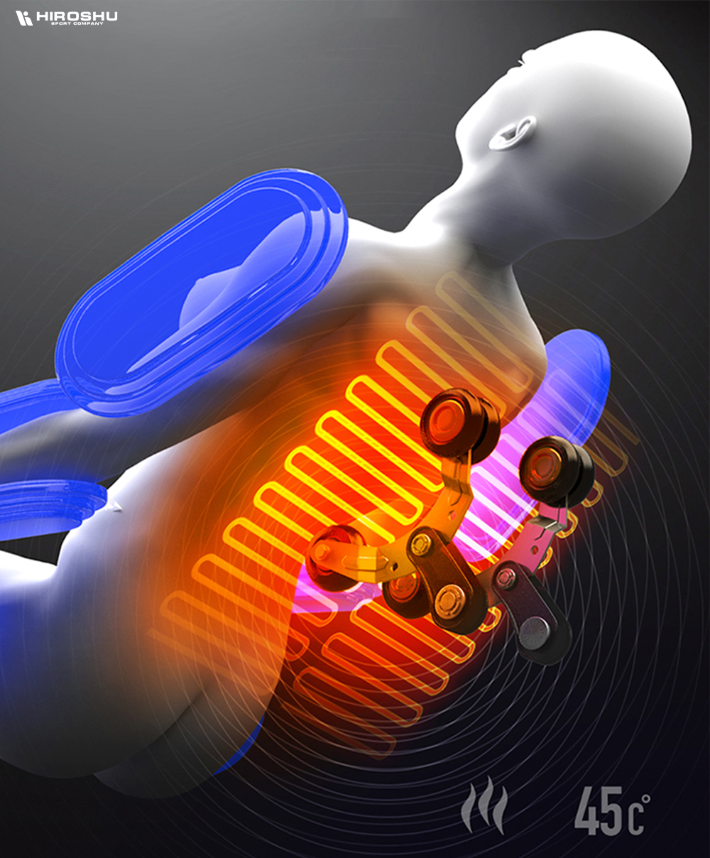 Ghế massage tỏa nhiệt hồng ngoại khắp cơ thể. Chức năng làm ấm cơ thể từ chế độ này giúp cơ thể lưu thông máu nhanh chóng. Hỗ trợ giảm đau nhức xương khớp hoặc các chứng co thắt cơ mãn tính như đau cổ vai gáy, đau thắt lưng, đau thần kinh tọa, đau khớp, đau thần kinh liên sườn, đau cơ,....