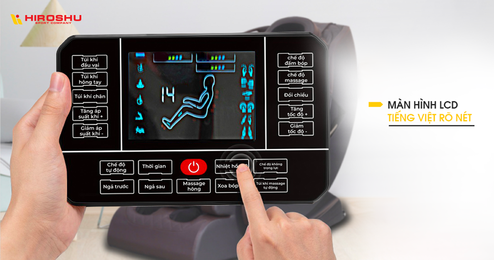 Ngoài ra, để tiện lợi hơn cho quý khách hàng, đặc biệt là người cao tuổi, Hiroshu Sport đã nghiên cứu và cho ra đời bảng điều khiển ghế massage toàn thân sử dụng tiếng Việt. Hiển thị rõ ràng các thông số, cỡ chữ to giúp đơn giản hóa cách thức dùng ghế cho người lớn tuổi.
