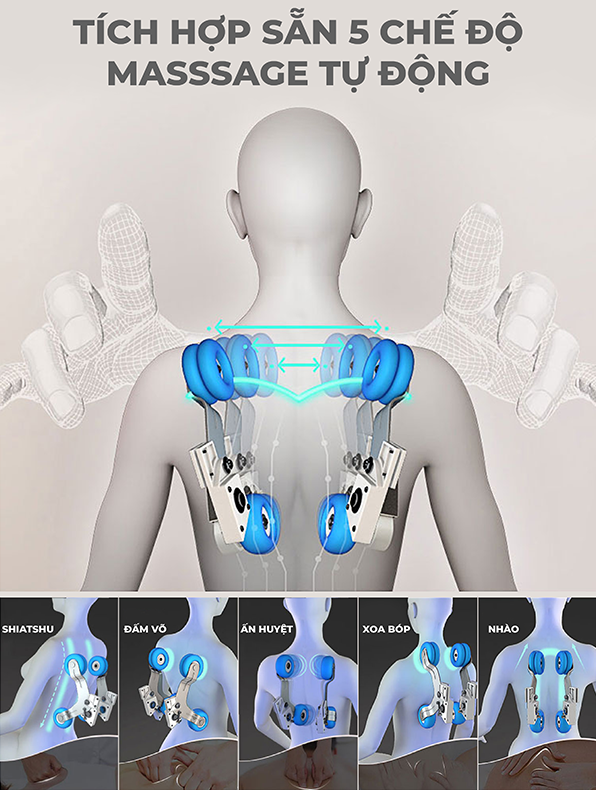 Thời gian massage từ 15-30 phút thiết kế sẵn 5 chế độ massage đa dạng bao gồm: Tự động, chuyên sâu, thư giãn,… Ngoài ra, con lăn còn có thể massage từng vùng riêng biệt trên cơ thể như cổ, lưng, mông. Vậy nên, bất kỳ thành viên nào trong gia đình với tình trạng sức khỏe ra sao sẽ đều có chế độ massage phù hợp.