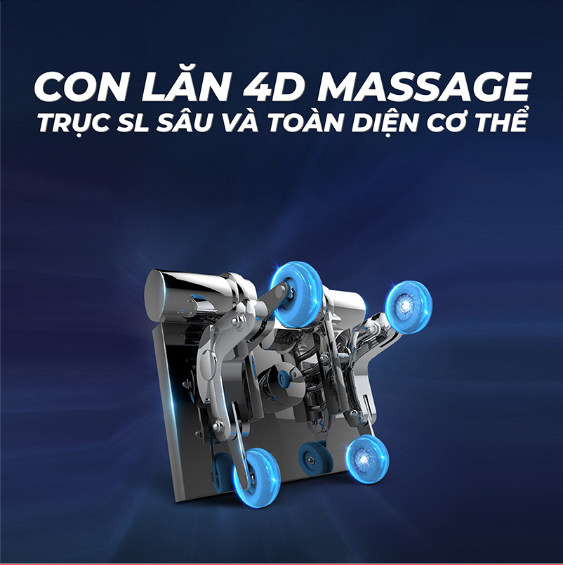 Hệ thống con lăn di chuyển 4D được tích hợp định vị AI, cải tiến Scan body chạy dọc xuyên suốt đến tận mông, hông, ôm sát cột sống mang đến cảm giác chân thật nhất cho từng động tác massage như của con người. Massage lên xuống với động tác bấm, vỗ, chặt, miết.