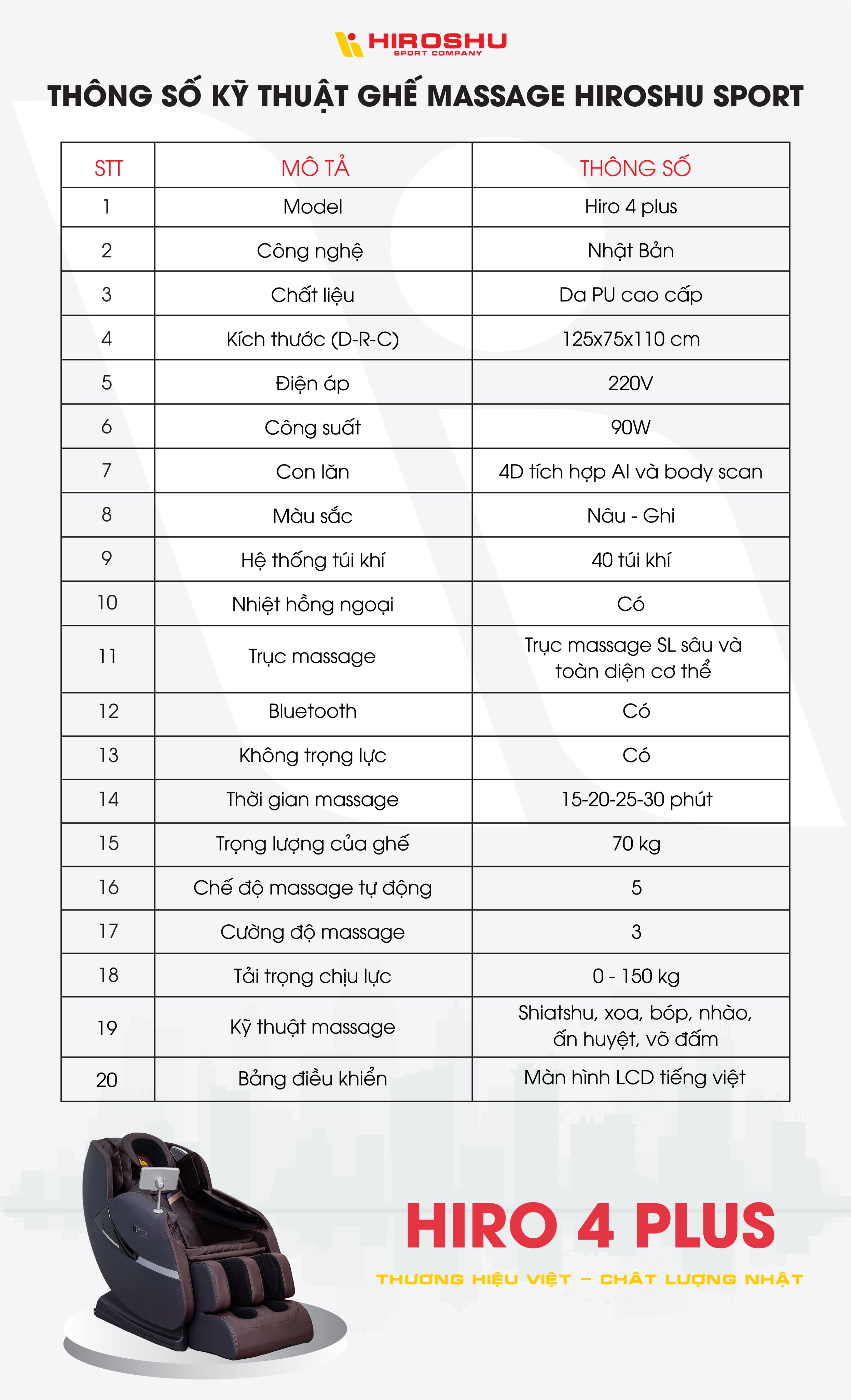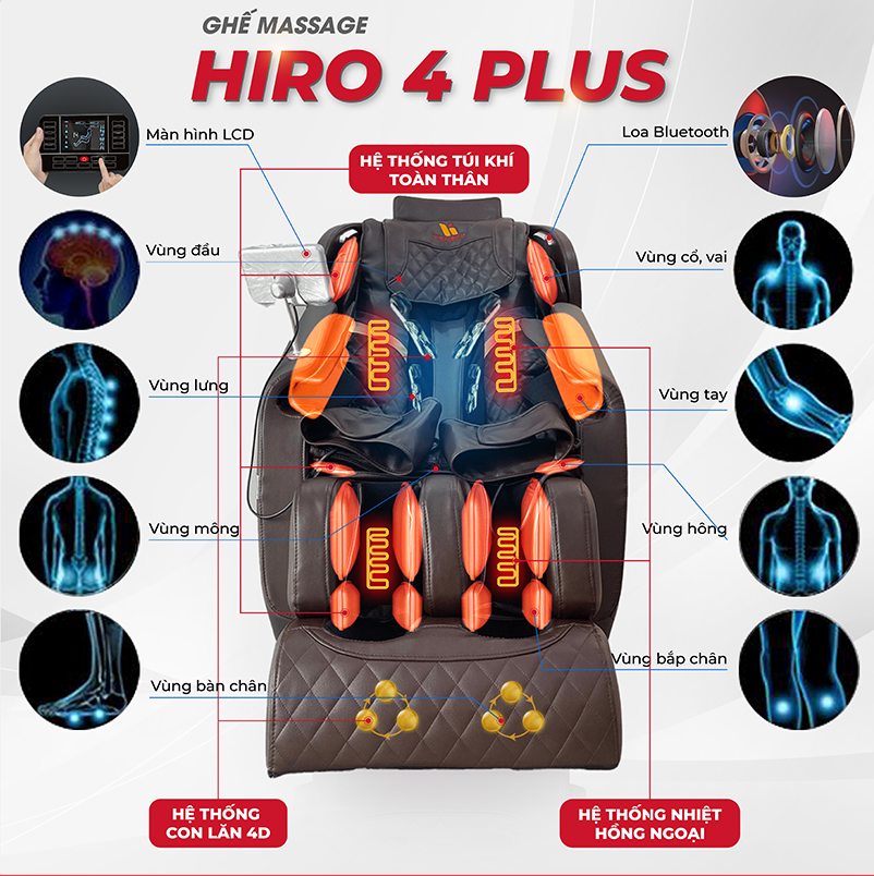 Ghế massage HIRO 4 plus thuộc công ty HIROSHU SPORT chỉ với mức giá tầm trung nhưng không thua kém gì những phân khúc ghế cao cấp có hệ thống con lăn 4D massage theo trục SL. Người dùng sẽ được trải nghiệm toàn bộ các động tác như đấm, vỗ, chặt, miết, bấm huyệt.... với gần 40 túi khí trải đều từ vùng đầu, vai, tay, xuống tận chân.