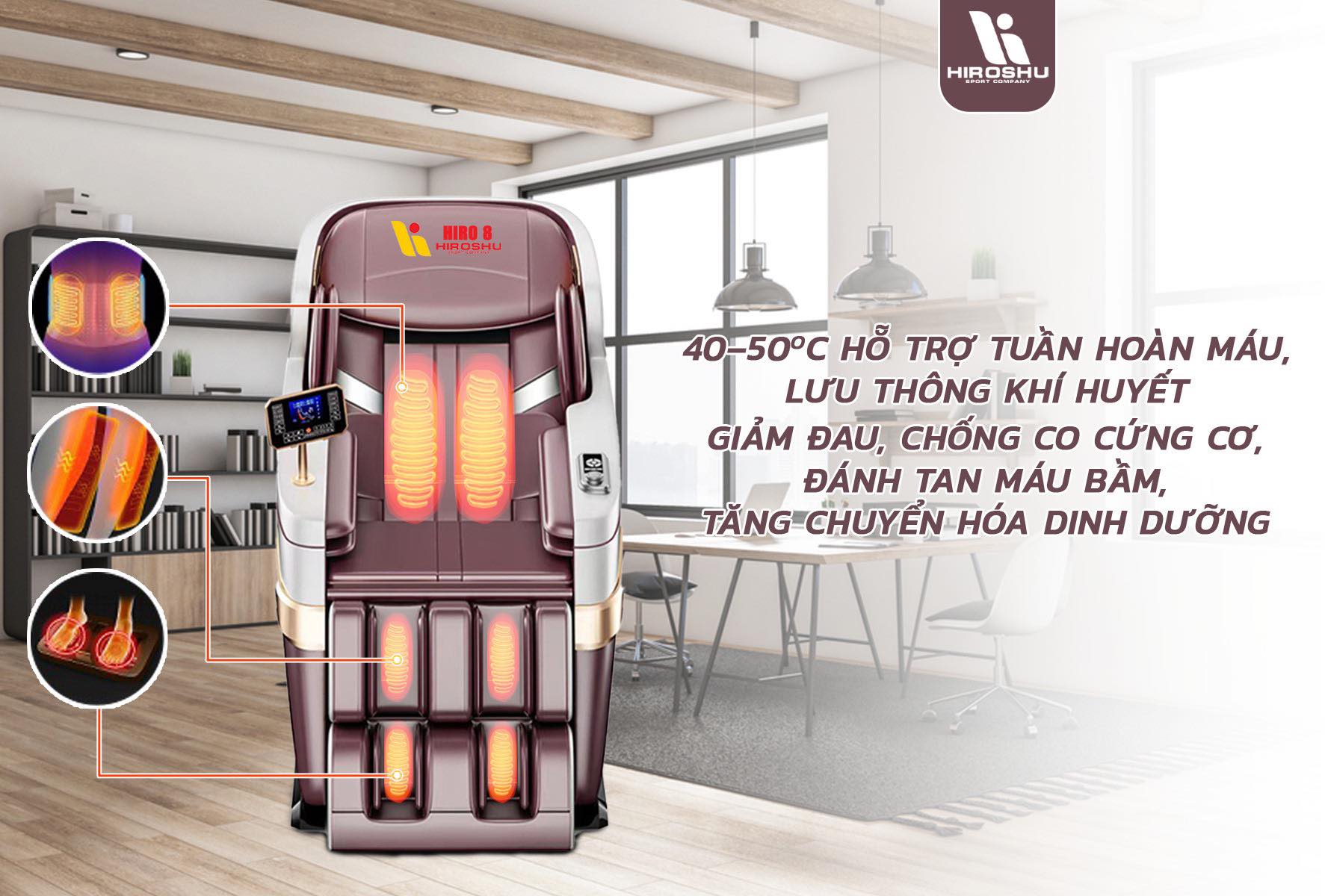 Ghế massage Hiro 8 từng chi tiết nhỏ đều được các kỹ sư trau chuốt tỉ mỉ, đặc biệt là chế độ massage nhiệt hồng ngoại. Mức nhiệt từ 40 độ C lên đến 55 độ C lan tỏa khắp cơ thể giúp giữ ấm cơ thể, hỗ trợ tuần hoàn máu, lưu thông khí huyết, giảm bớt gánh nặng bơm/đẩy cho tim, giảm đau, chống co cứng cơ, làm giãn mạch, đánh tan máu bầm, tăng chuyển hóa và dinh dưỡng tại chỗ. Ngoài ra phải nói đến tác dụng chăm sóc hệ xương khớp, giảm tình trạng đau cơ do vận động quá sức. Bên cạnh đó, việc bố trí nhiệt hồng ngoại phần eo góp phần đốt mỡ thừa hiệu quả.