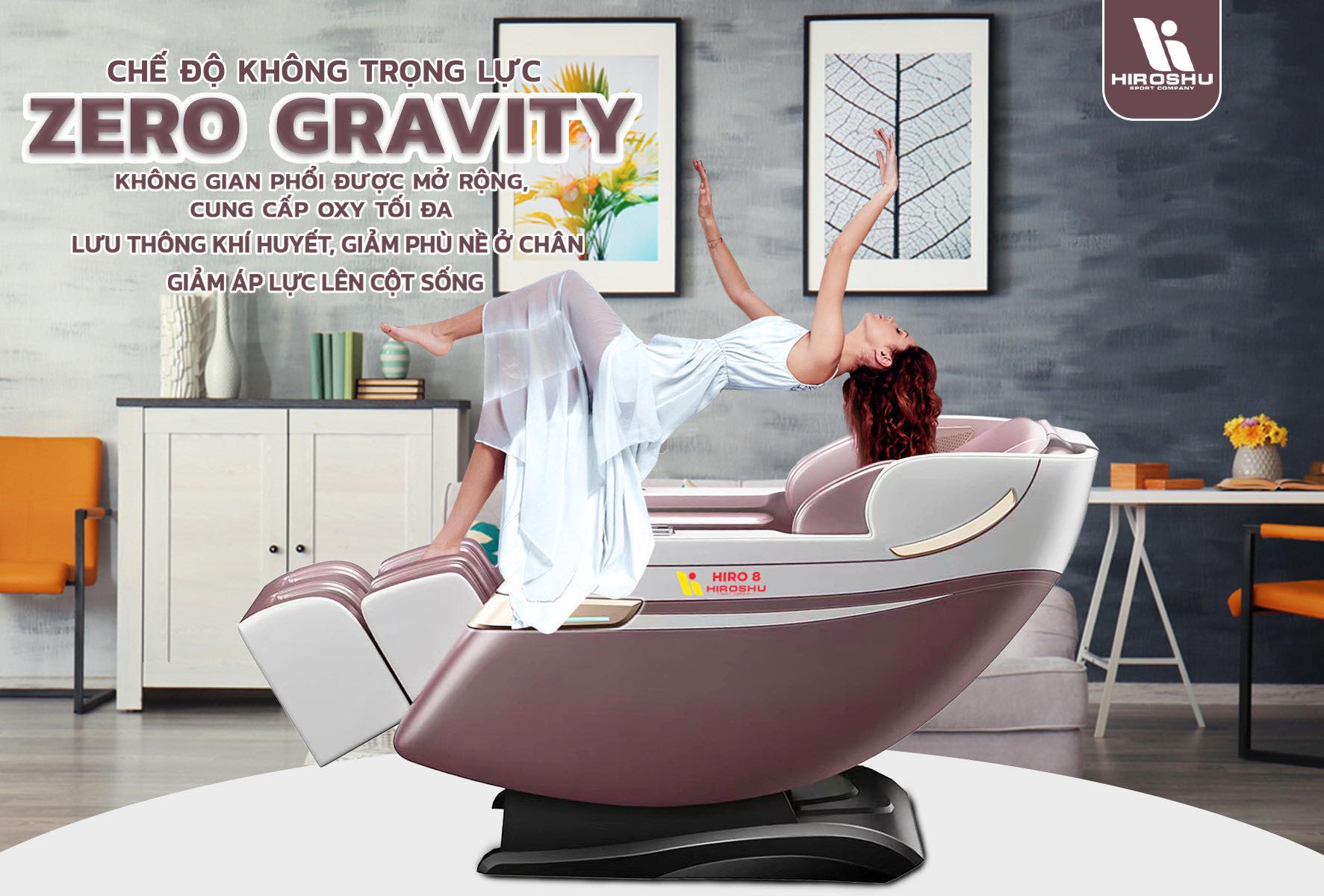 Chế độ không trọng lực Zero Gravity ghế được ngả ra mô phỏng như một chiếc võng làm giảm áp lực lên cột sống, áp lực ở cơ hoành giúp không gian phổi được mở rộng hơn, giúp cung cấp lượng oxy tối đa cho máu, tăng cường lưu thông khí huyết, giảm phù nề ở chân, chức năng phổi sẽ được khỏe mạnh hơn từng ngày.
