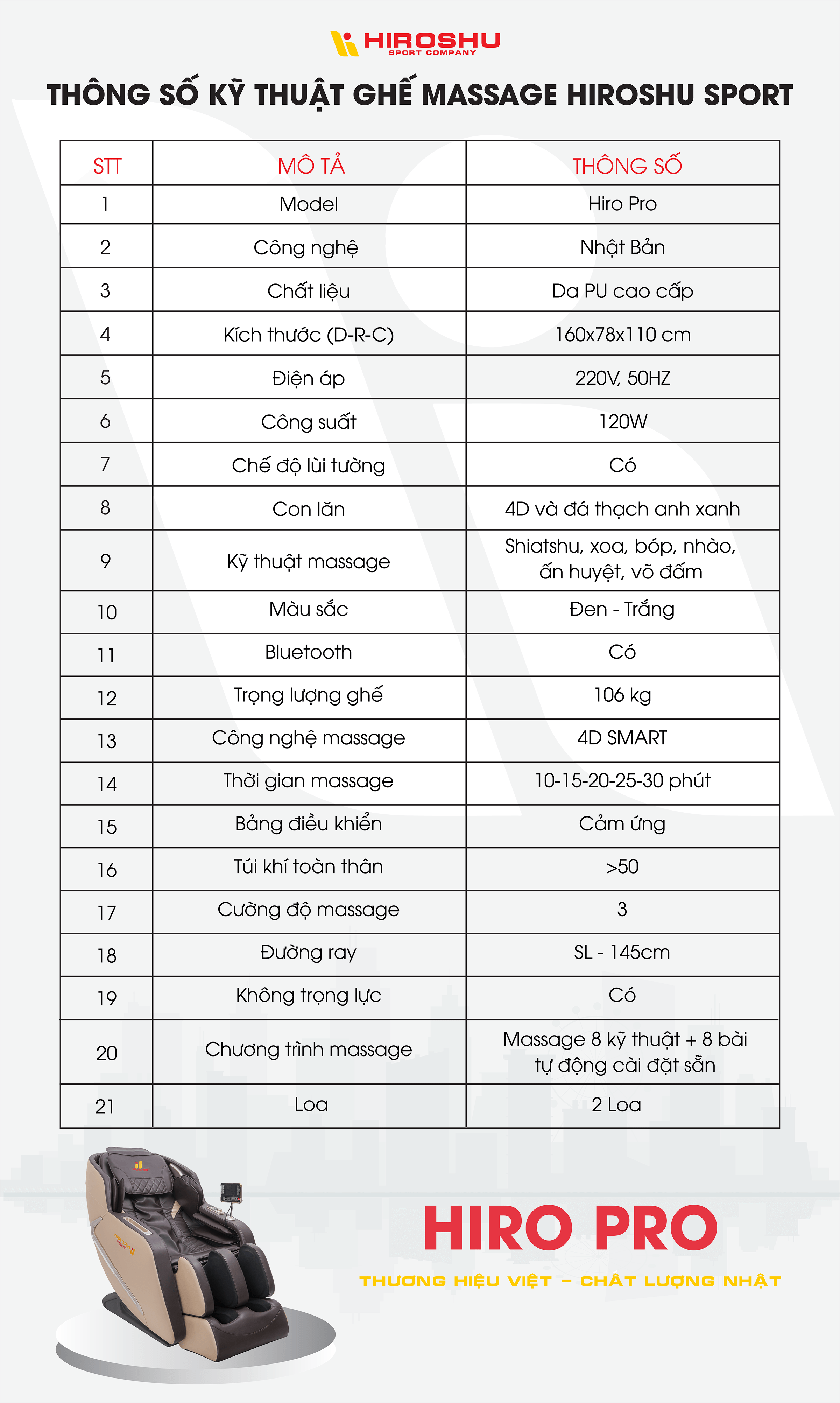 Ghế massage Hiro Pro thuộc công ty HIROSHU SPORT được thiết lập nhiều cấp độ massage khác nhau. Nhờ vậy sẽ tác động đa chiều, tận sâu vào các huyệt đạo của những vùng cơ, xương khớp trên cơ thể. Hệ thống con lăn 4D chuyên nghiệp và chân thực hơn như một người thợ massage lành nghề đến mức đấm bóp, nhào nắn đủ lực mà không hề gây đau nhức cơ thể. Ưu điểm của Hiro Pro nằm ở chỗ có con lăn bàn chân, tác động vào huyệt đạo hiệu quả giúp thư giãn các cơ bắp phần dưới, phục hồi độ linh hoạt khi di chuyển.