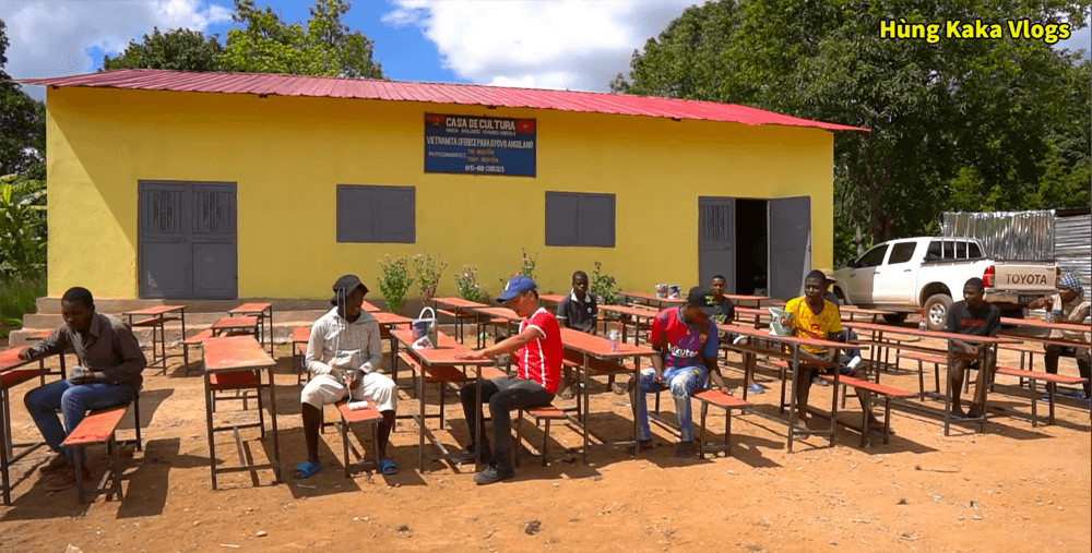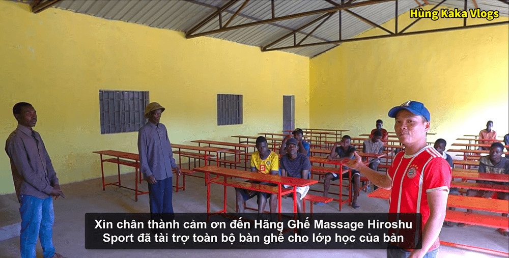 Hùng Kaka thay mặt Hiroshu Sport trao gửi bộ bàn ghế đến học sinh bản làng Angola