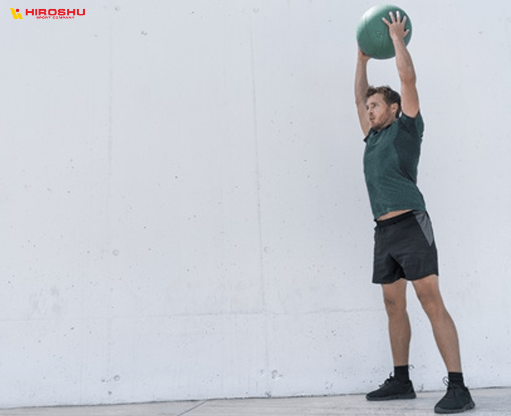 - Bật nhảy nhanh, hai chân mở rộng bằng vai, nâng bóng qua đầu bằng hai tay.