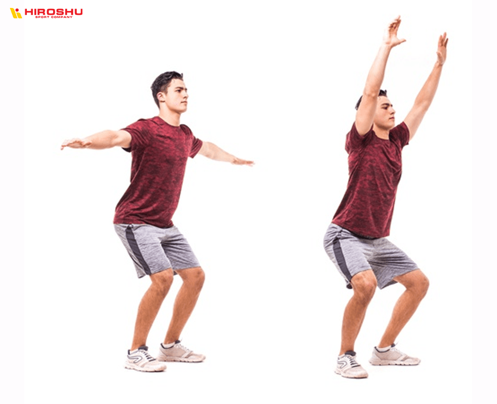 - Chùng chân bật nhảy cao sao cho dang rộng hai chân hơn vai, lưu ý hướng mũi chân ra ngoài. Tiếp đất, hông hạ xuống tư thế squat, đảm bảo song song đùi với sàn. Không vượt đầu gối quá mũi chân. Trong khí đó, duỗi 2 tay dọc 2 bên đùi.