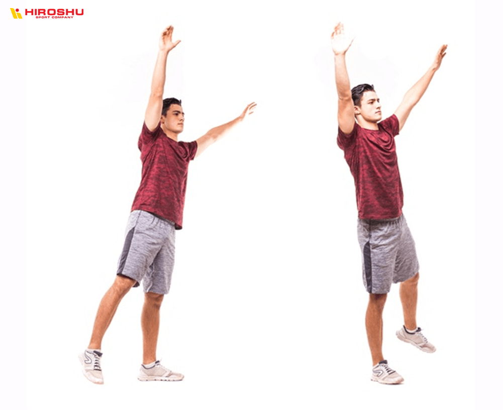 - Bạn tiến hành bật nhảy chân sang 2 bên kết hợp 2 tay giơ lên cao qua đầu. Sau đó nhảy lùi lại về vị trí cũ.