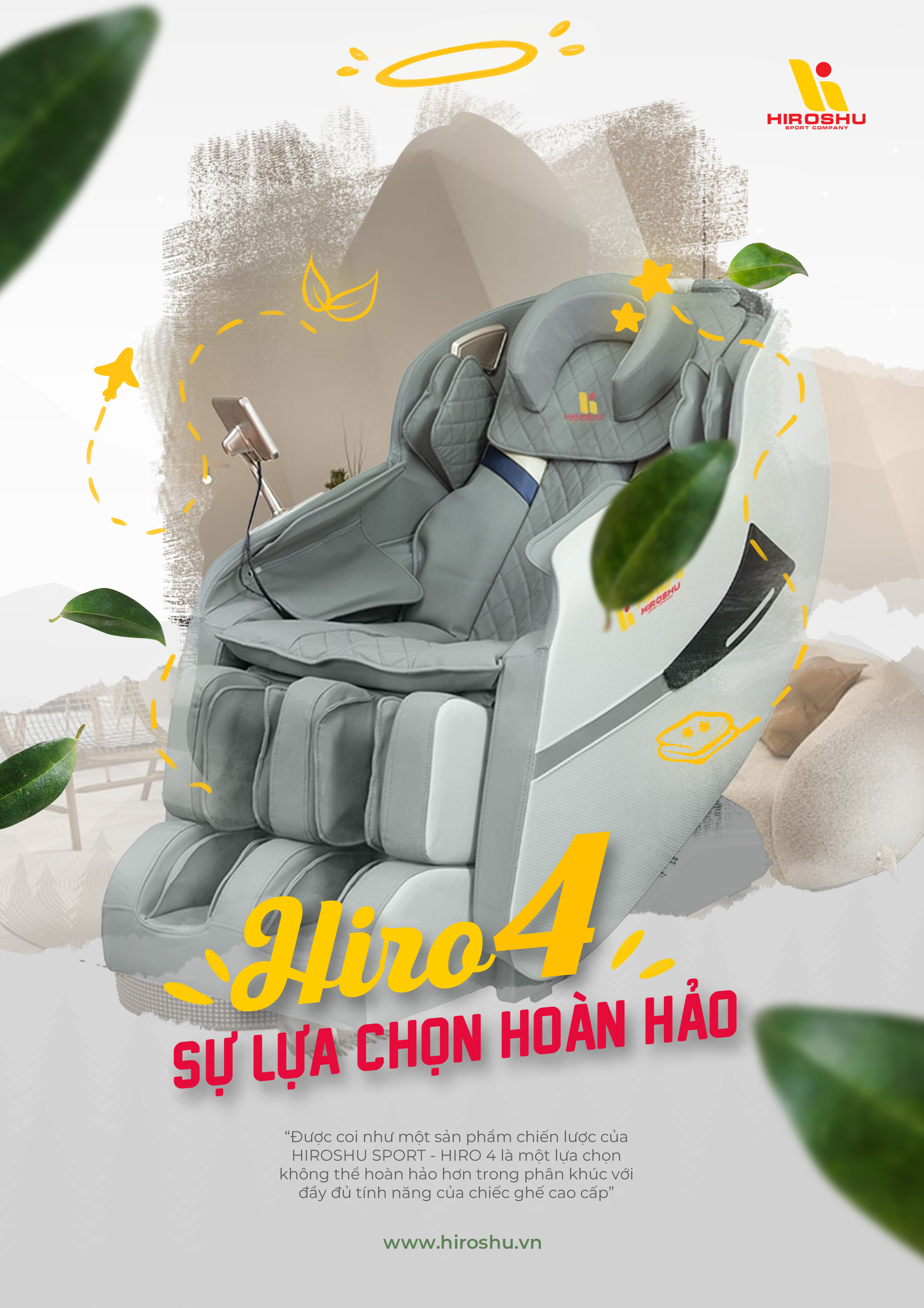 Khi đã bắt đầu tìm hiểu cũng như có nhu cầu mua một chiếc ghế massage thì sẽ thật là thiếu sót lớn nếu bạn bỏ qua Hiro 4 của Công ty Hiroshu Sport - thương hiệu Việt nhưng chất lượng Nhật. Chỉ cần bỏ ra mức kinh phí dưới 20 triệu, tất cả những trải nghiệm mà dòng ghế massage này mang lại hứa hẹn sẽ chinh phục bạn ngay từ lần dùng thử đầu tiên. Toàn bộ ghế còn được bọc da PU rất bền lên đến tận 10 năm với tông màu vô cùng sang trọng, phù hợp cho mọi không gian nhà. Đặc biệt kích thước và trọng lượng ghế vừa phải, không chiếm quá nhiều diện tích nên cực kỳ tiện lợi.