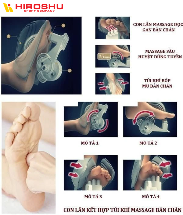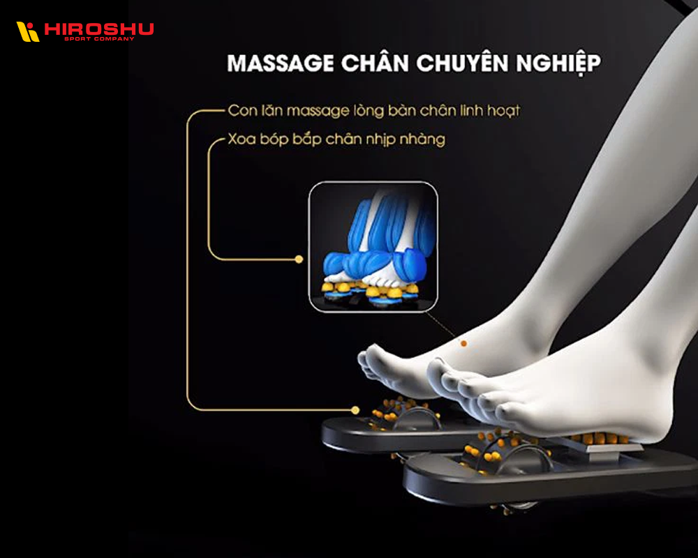 Thấu hiểu được tầm quan trọng của việc chăm sóc bàn chân thường xuyên, Hiroshu Sport đã tinh tế đưa thêm các bài tập massage chân vào sản xuất ghế massage. Nhờ đó người dùng không chỉ được thư giãn toàn bộ cơ thể mà còn được tận hưởng cảm giác từng con lăn như đôi bàn tay thợ lành nghề ấn, day lên từng huyệt đạo trên đôi chân bạn.