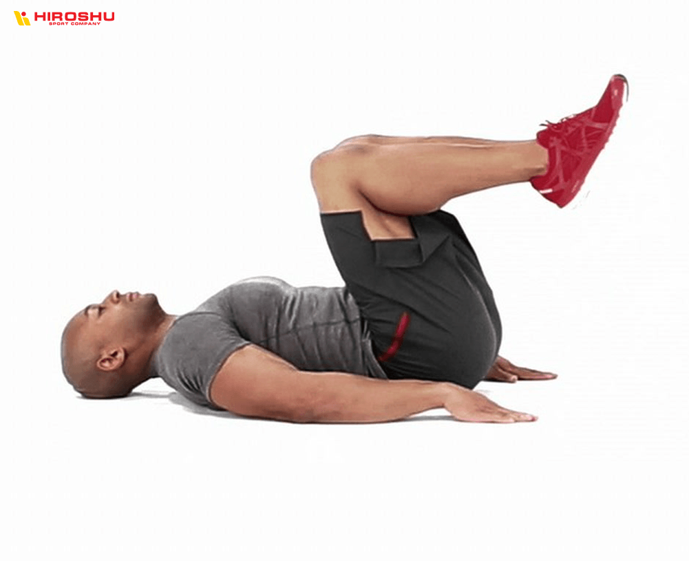 - Khi co cơ bụng, thực hiện thở ra để hông cong lên và đẩy đầu gối về phía ngực, khi bạn cong người, chỉ phần hông chạm xuống sàn. Trong suốt giai đoạn hướng lần này, giữ nguyên đầu gối một góc. Giữ thẳng đầu của bạn, vai và cổ phải được thư giãn trên sàn. Giữ lưng không rời khỏi mặt thảm.