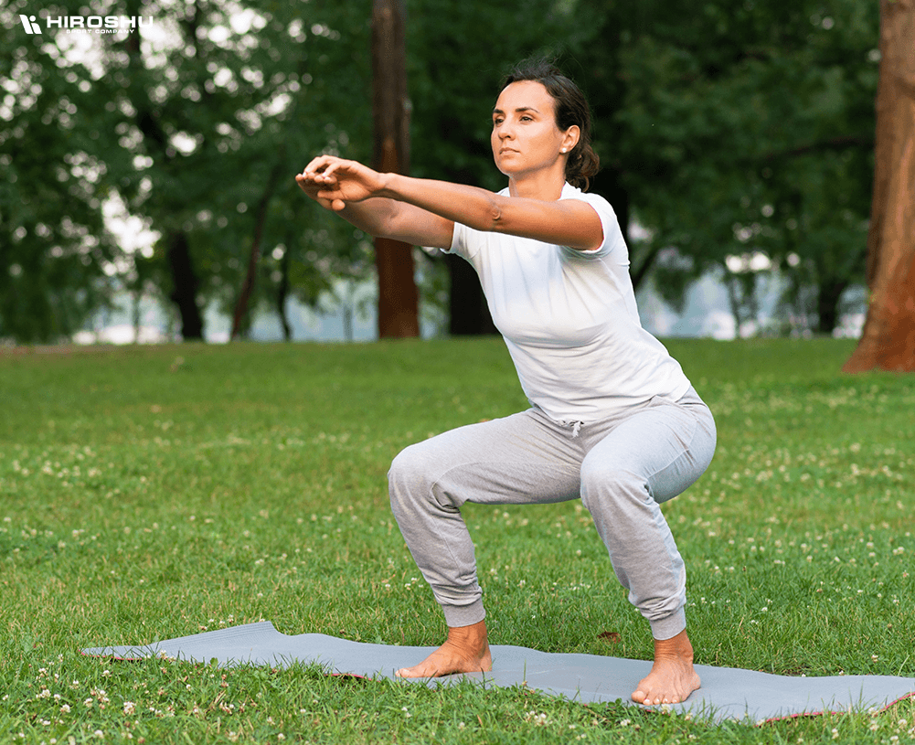 - Đầu gối gập xuống chuyển sang tư thế ngồi xổm sao cho đùi và mặt sàn song song nhau. Đưa 2 bàn tay ra phía trước và chạm vào nhau.