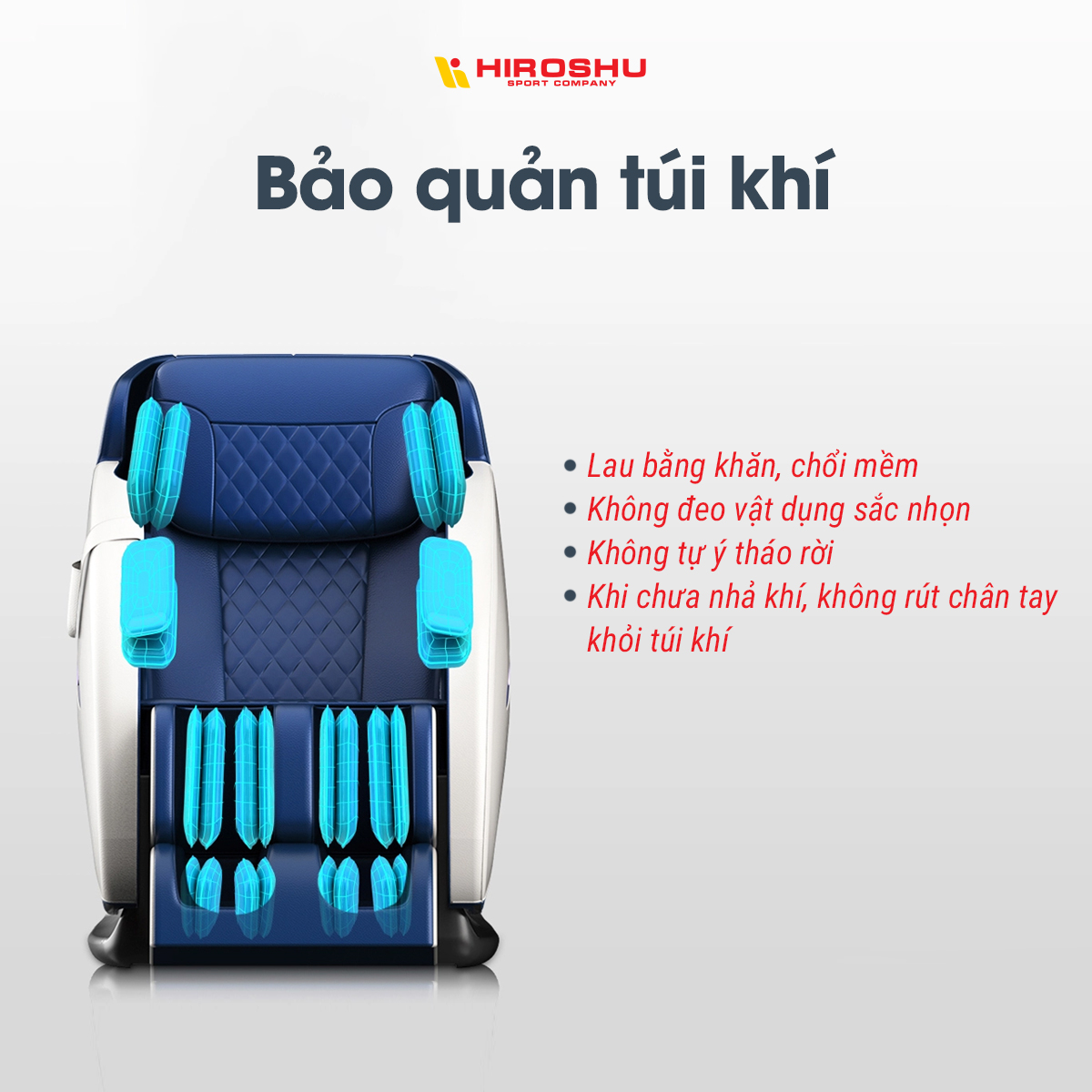 Túi khí của ghế massage là một bộ phận rất quan trọng của một chiếc ghế massage. Vì vậy chúng cần được bảo quản và vệ sinh đúng cách để tránh xước, sờn hay rách gây ảnh hưởng đến thẩm mỹ và công dụng của ghế massage. Hãy cùng Hiroshu Sport tìm hiểu về cách bảo quản những chiếc túi khí này: